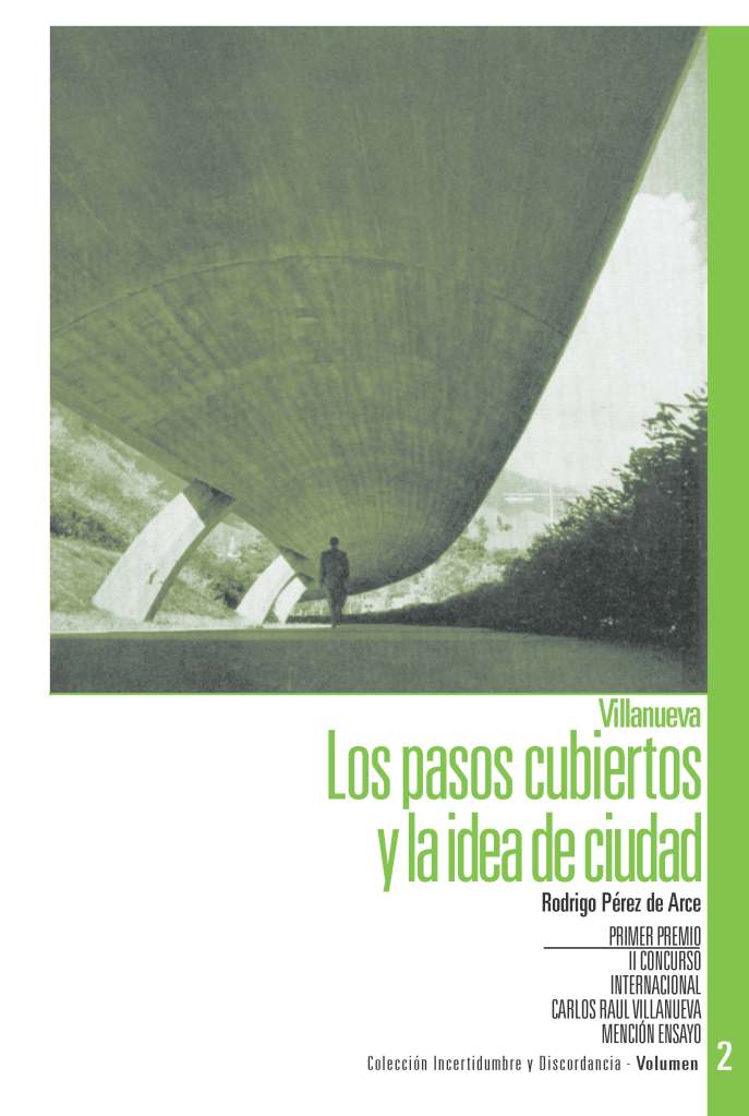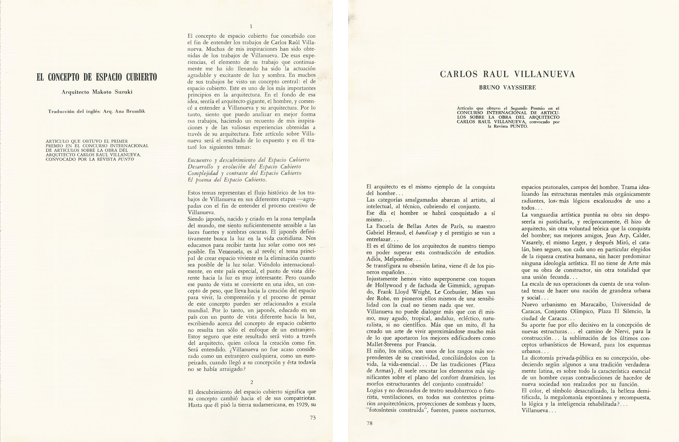 En primer lugar, hay que decir que el texto contenido en el sencillo pero muy atractivo producto impreso por Ediciones Facultad de Arquitectura y Urbanismo (cuyo concepto editorial correspondió a Iván González Viso y diseño gráfico a Metaplug C.A., Eduardo López y Lucas García), se inició con la convocatoria el año 2000 del II Concurso Internacional Carlos Raúl Villanueva, Mención Ensayo, en medio de las celebraciones del centenario del nacimiento del Maestro venezolano, del cual el escrito de Pérez de Arce resultó ganador en muy buena lid. Esta segunda versión del certamen se produjo casi treinta años después de que la revista Punto organizara la primera en momentos en que preparaba una edición especial dedicada a Villanueva, asignatura que tenía pendiente desde hacía mucho tiempo. Aquel llamado dio como resultado el que fuera seleccionado como triunfador el evocador escrito enviado en inglés por el arquitecto japonés Makoto Suzuki titulado “El concepto de espacio cubierto”, que sería traducido al español por Ana Brumlik y saldría publicado en la mencionada edición especial que ocupó el nº46 (junio de 1972). El segundo premio le correspondería a Bruno Vayssiere con el artículo “Carlos Raúl Villanueva”.