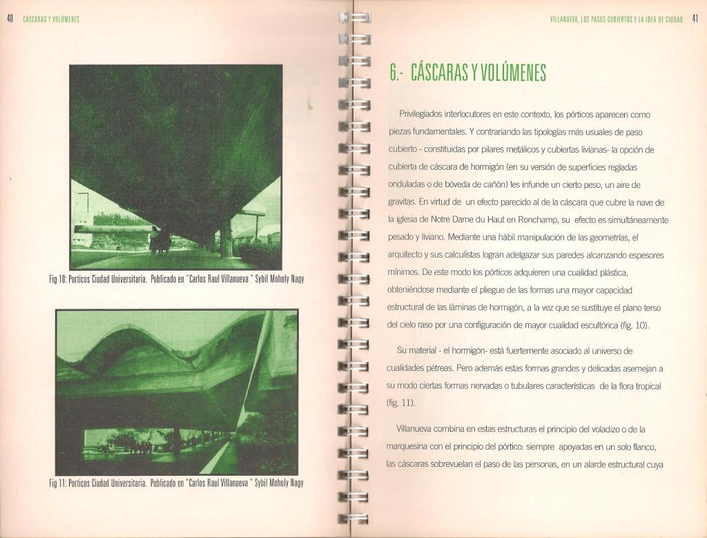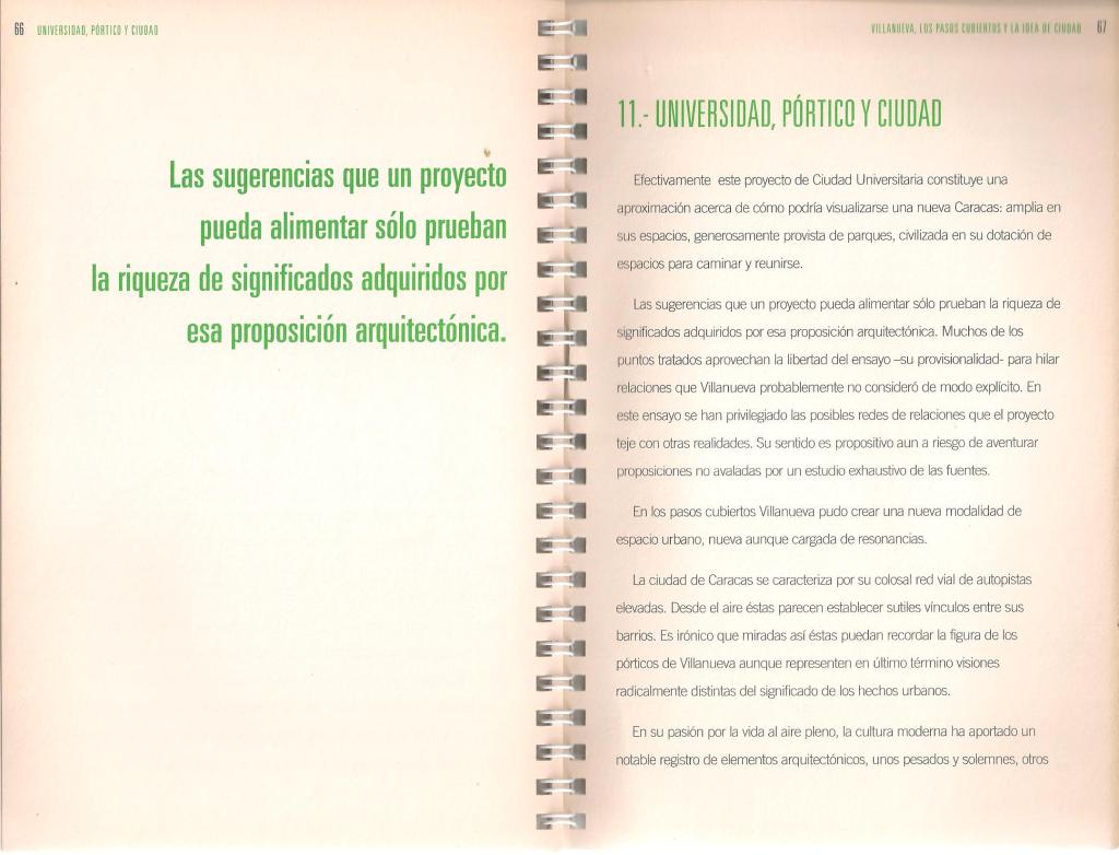 Luego, dejará servida la mesa para que el lector disfrute de la lectura del trabajo, develando desde el punto de vista conceptual la esencia de la exploración que emprenderá relacionada con el título del ensayo: “Claustro y Universidad se confunden en una misma expresión: en su relación con el claustro la idea de universidad evoca un formato espacial concreto cuya tipología perfectamente identificable se materializa en patios y pórticos. Estos ámbitos quedan entonces reconocidamente vinculados a la búsqueda del saber. El claustro universitario remite a la institución a su origen programático e histórico -cuya localización primera es el monasterio- aportando con ello una asociación tipológica y programática de doble faz. Este vínculo es importante a la hora de realizar un nuevo proyecto de Universidad; Villanueva parece recogerlo recurriendo en su proyecto al porticado, elemento constitutivo del claustro. Villanueva lo desprende figurativamente de su soporte, aislándolo de la masa edificada a la cual está usualmente asociado y lo emplaza en los jardines en plena autonomía como una figura libre para cumplir su función conectora. Esta operación, sus alcances y significados constituyen el argumento central de este escrito”, concluirá.