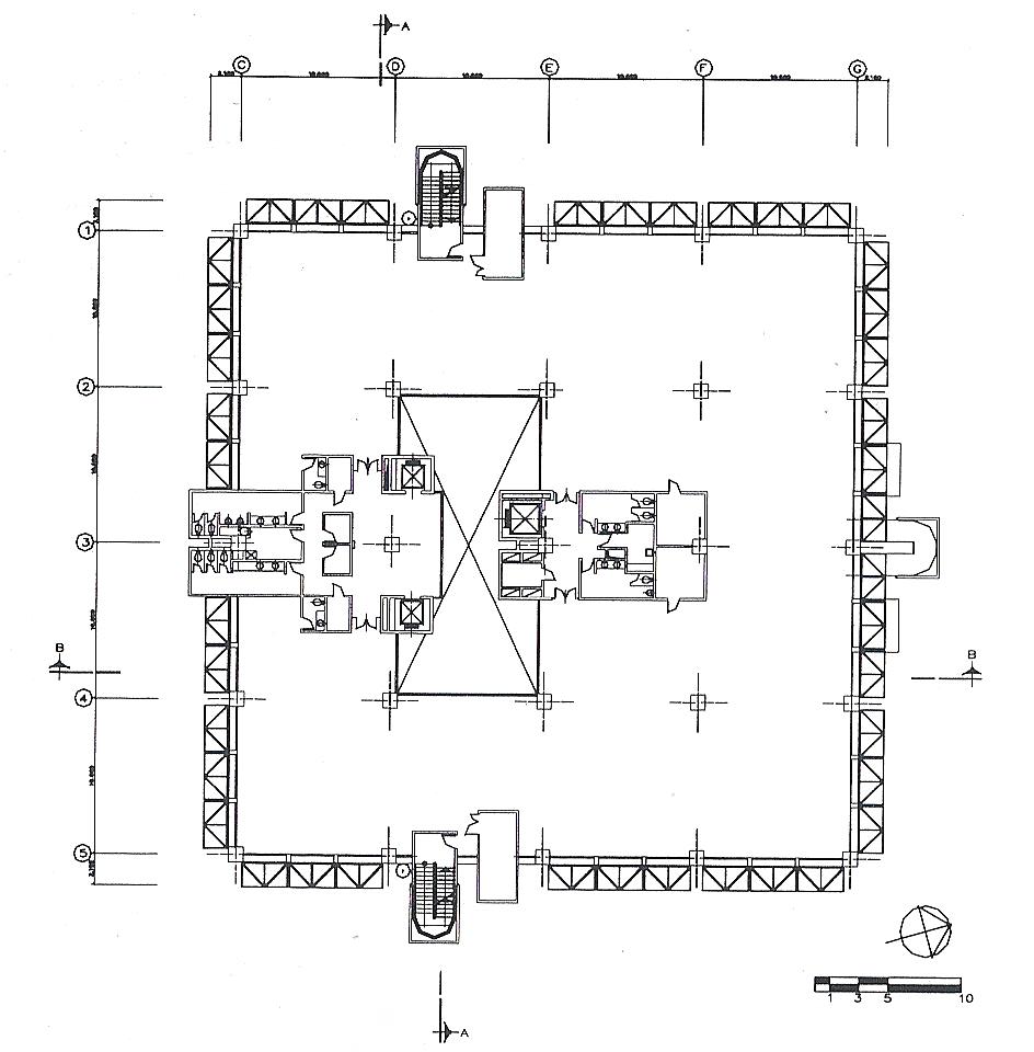 Resuelto respondiendo adecuadamente a la complejidad urbana de un terreno que posee dos esquinas, los 28.000m² de área bruta de construcción que tiene la edificación se encuentran distribuidos en tres sótanos con capacidad para 330 vehículos, dos niveles de uso comercial con acceso directo desde las calles, ocho plantas tipo destinadas a oficinas y dos niveles de remate reservados en este caso a oficinas ejecutivas con terrazas, jardines y espacios de doble altura.