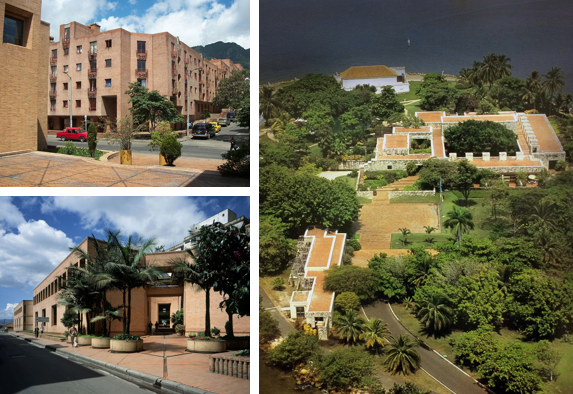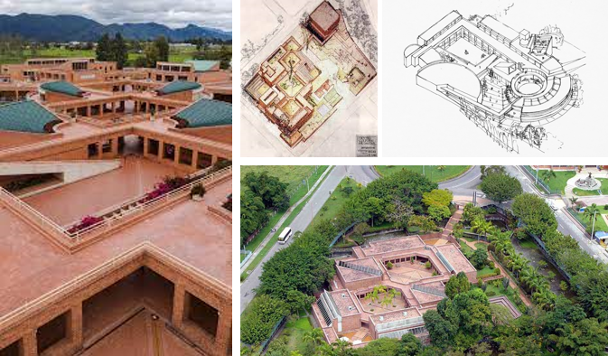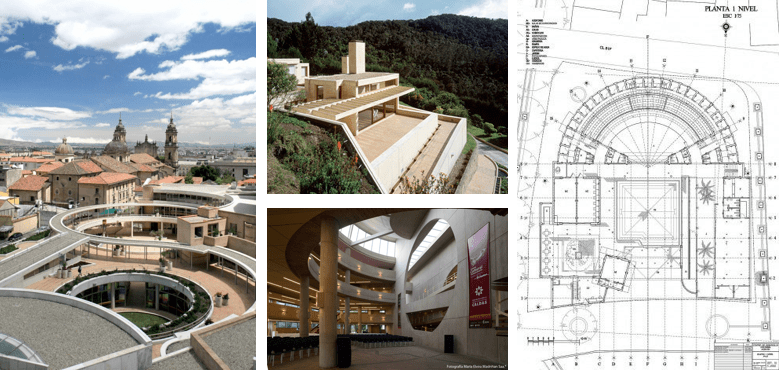 “Composición y recorrido presenta algunos de sus proyectos más interesantes, donde explora la simultaneidad y la sucesión de espacios en los cuales el usuario es invitado a descubrir la totalidad de las superficies, como techos y cubiertas, reconociendo el edificio al recorrerlo”. Para ejemplificar este eje temático dentro de la exposición fueron seleccionados: el Centro Cultural Jorge Eliécer Gaitán, Bogotá (1975-89), el Museo Quimbaya, Armenia (1984-85), el Colegio Gimnasio Fontana, Bogotá (1992-2005) y el Edificio de Postgrados de Ciencias Humanas, Universidad Nacional de Colombia, Bogotá (1995-99).