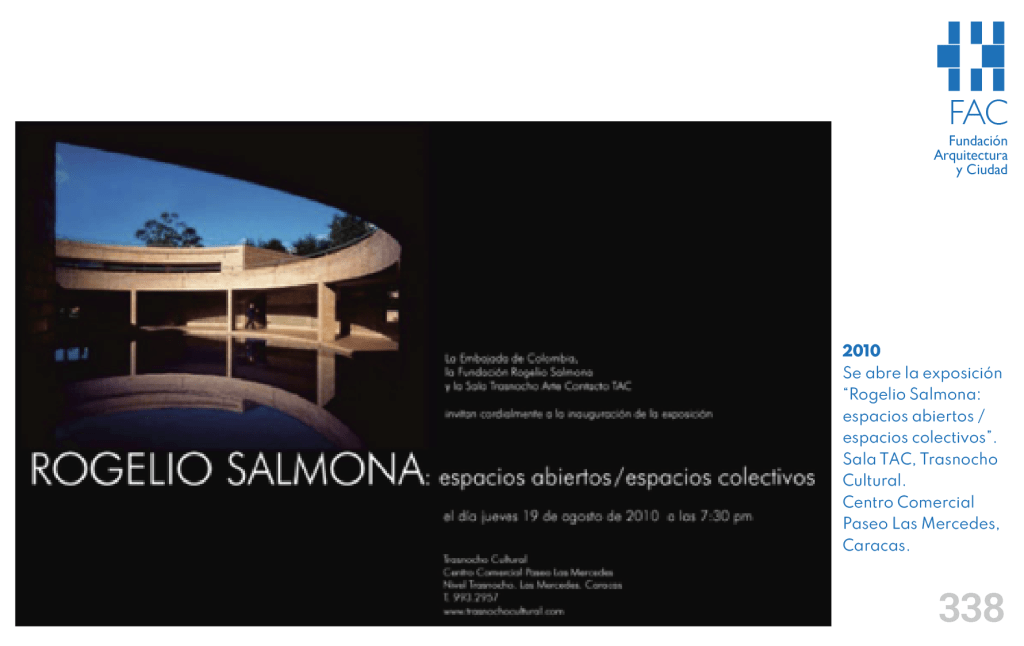 La exposición itinerante “Rogelio Salmona: espacios abiertos/espacios colectivos” llega a Caracas el año 2010, con los auspicios de la Embajada de Colombia, la Fundación Rogelio Salmona y la Sala Trasnocho Arte Contacto TAC, como una de sus últimas escalas internacionales, tras haber sido montada por primera vez en 2006 e iniciado un periplo que la llevó a ser apreciada en 16 países de Europa, Asia y América y en las ciudades más importantes del mundo.