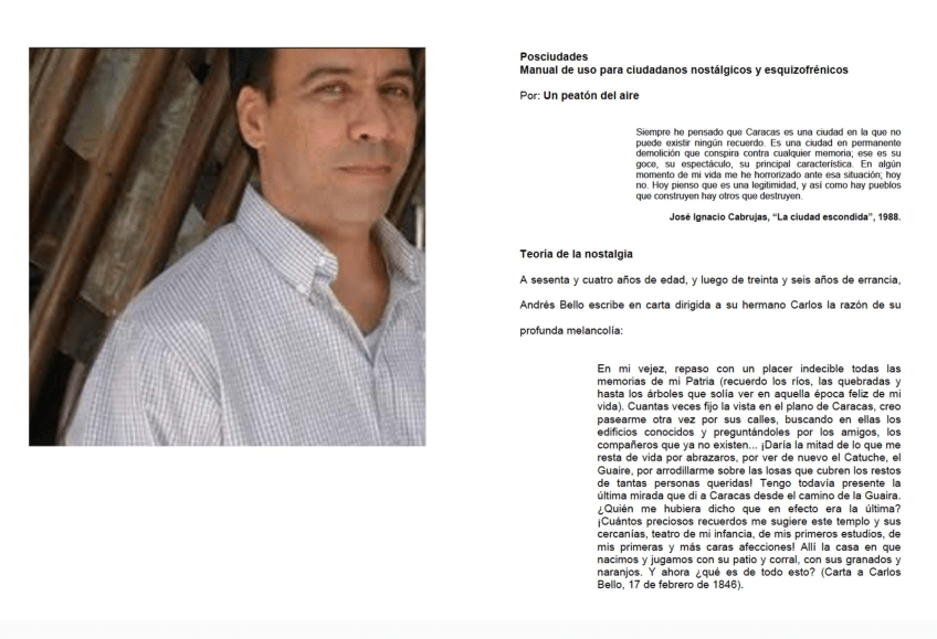 Caracas al llegar a su 450 aniversario luce agotada, descuidada, olvidada, deteriorada, desarticulada y agredida, y a la vez preservada por su inmejorable clima, su inigualable paisaje y el calor de su gente. Por ende, ofrece la oportunidad única de mirarla sin dejar de pensarla, sentirla, mimarla, reivindicarla, desearla, soñarla, recordarla, imaginarla, proyectarla…