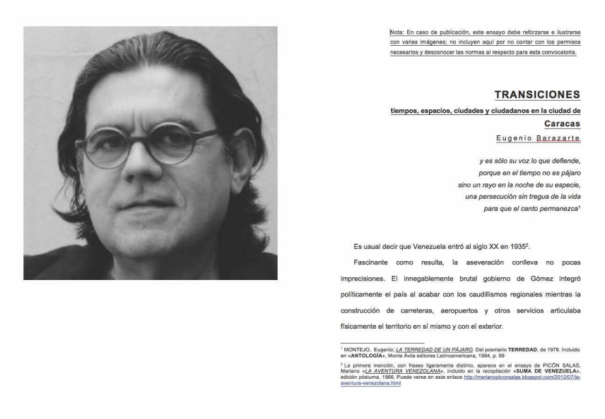 El pasado lunes 9 de octubre el jurado evaluador del Concurso de Ensayos «Caracas 1567-2017», integrado por Rafael Arráiz Lucca, Marco Negrón y Juan Pedro Posani, Miembros Honorarios de la Fundación Arquitectura y Ciudad, decidió por unanimidad, luego de revisar los 15 trabajos entregados e intercambiar opiniones al respecto, otorgar el Primer Premio al texto titulado «Posciudades. Manual de uso para ciudadanos nostálgicos y esquizofrénicos», firmado con el seudónimo “Un peatón del aire”. Asimismo decidió otorgar el Segundo Premio al ensayo «TRANSICIONES. Tiempos, espacios, ciudades y ciudadanos en la ciudad de Caracas», identificado con el seudónimo “Eugenio Barazarte”.