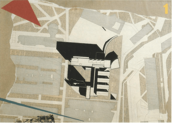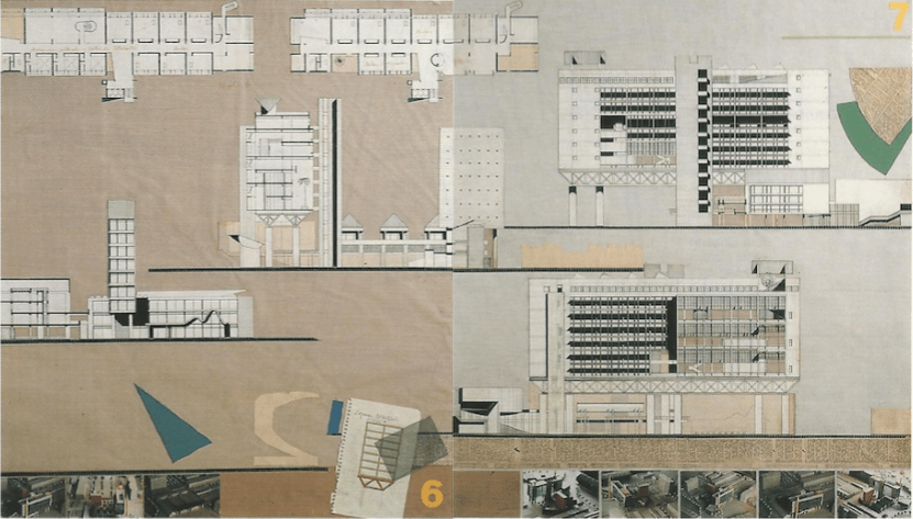Nos aclara Enrique, con razón, que la imagen que ilustra la postal no forma parte del material presentado para el concurso en 1986, el cual si se recoge en el desarrollo del texto proveniente de la revista PUNTO nº 66-67. El dibujo en cuestión corresponde a la propuesta presentada en 1990 cuando ya trabajaba en solitario, la cual estuvo precedida por “dos anteproyectos anteriores (el ‘formal»’ se presentó en 1988 y la universidad entró en un larguísimo paro durante el cual se desarrolló otro en 1989 y, ya en 1990, el que se presenta en la Postal)”, todo lo cual no hace sino sumar más elementos al largo camino que se tuvo que transitar.