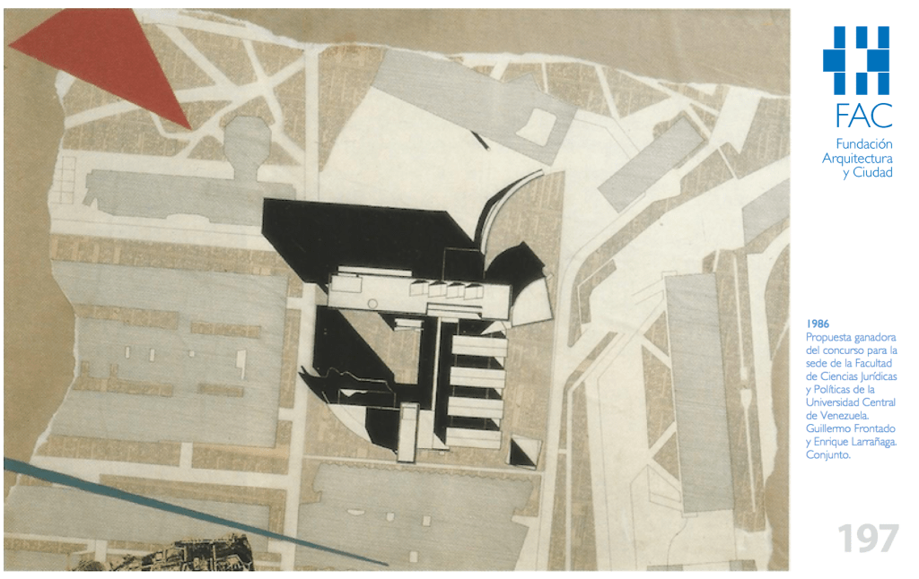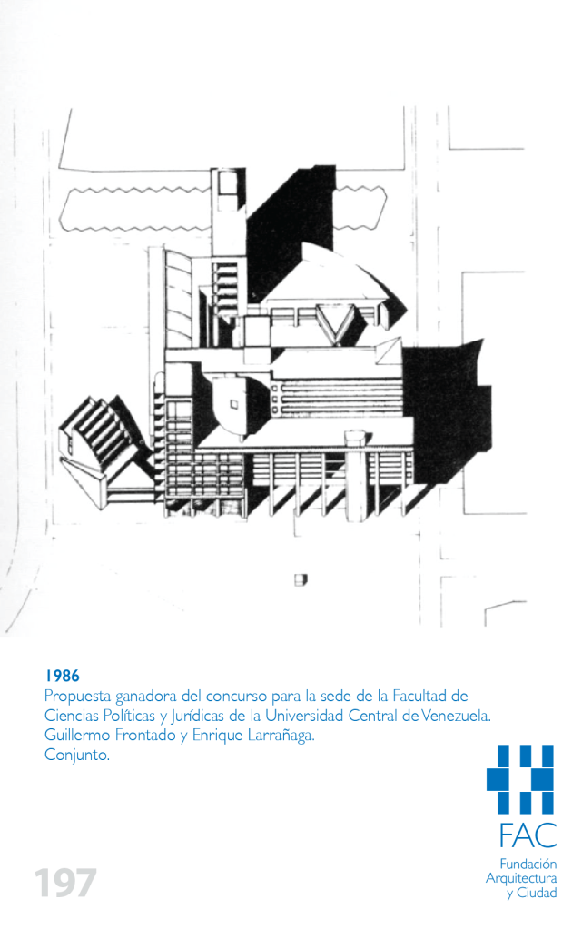 1986• La Universidad Central de Venezuela organiza el Concurso Sede de la Facultad de Ciencias Jurídicas y Políticas de la UCV, a ser edificada en la Ciudad Universitaria de Caracas, obteniendo el Primer Premio: Guillermo Frontado (arquitecto, USB, 1977) y Enrique Larrañaga (arquitecto, USB, 1977).