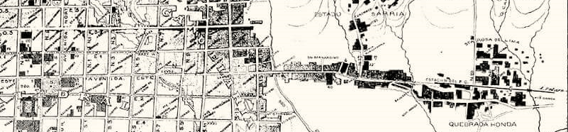 5. Detalle del Plano de Caracas de Ricardo Razetti de 1906 donde se puede observar la carretera que unía el centro con la estación Santa Rosa en Quebrada Honda y el inicio de la ruta del tren hacia Petare.