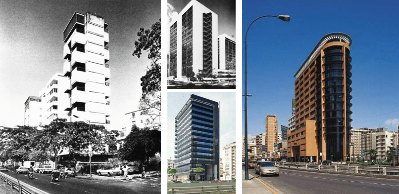 9. Izquierda: Edificio 10-18. Centro arriba: Edificio sede de PDVSA. Centro abajo: PDVSA Torre Sur. Derecha: Torre KPMG.