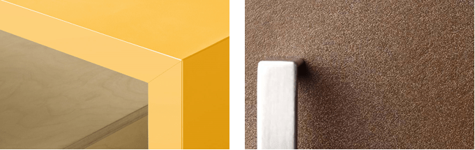 Izquierda: En 1982 Formica presenta ColorCore®, material de revestimiento de alto rendimiento completamente homogéneo en toda su masa. Derecha: En 1990 se presenta la colección internacional de laminados de metal que en 2001 ya tendrá marca propia: Formica DecoMetal®.