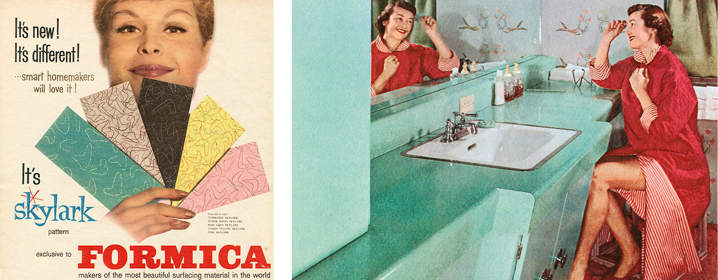 Izquierda: En 1950 Brooks Stevens crea la primera invención gráfica de la compañía: el icónico diseño «Skylark» rebautizado «Boomerang» en 1954. Derecha: 1953: Formica inventa nuevas técnicas de postformado para doblar laminados.