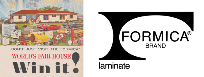 Izquierda: Propaganda de Formica en el catálogo de la Feria Mundial de Nueva York de 1965. Derecha: En 1978, la Comisión Federal de Comercio (FTC) de los Estados Unidos intentó retirar la marca registrada de Formica alegando que la palabra “Formica” se había convertido en un término genérico.