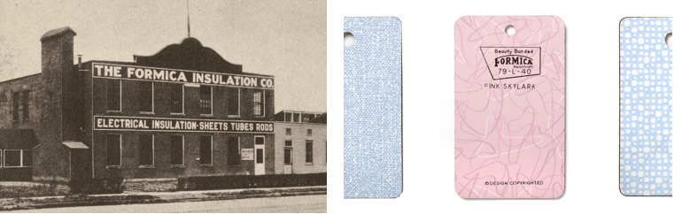 En 1917 Formica Insulation Company establece sus primeros contactos con la incipiente industria radiofónica y desarrolla los primeros componentes de comunicación para la Marina y el Cuerpo de Comunicaciones del ejército estadounidense y, tras su conversión en marca registrada en 1922, será en 1927 cuando la compañía “crea el primer laminado decorativo con resinas amino y una capa de barrera opaca para bloquear el interior oscuro”, lo cual supone el comienzo de un cambio de enfoque de los productos industriales a los decorativos.
