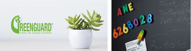 Izquierda: Las fábricas que producen el laminado marca Formica obtienen en 2011 la certificación GREENGUARD® de calidad del aire interior. Derecha: En 2012 Formica Group “se convierte en el primer fabricante de laminados en el mundo que recibe la etiqueta Carbon Trust de reducción de carbono”.