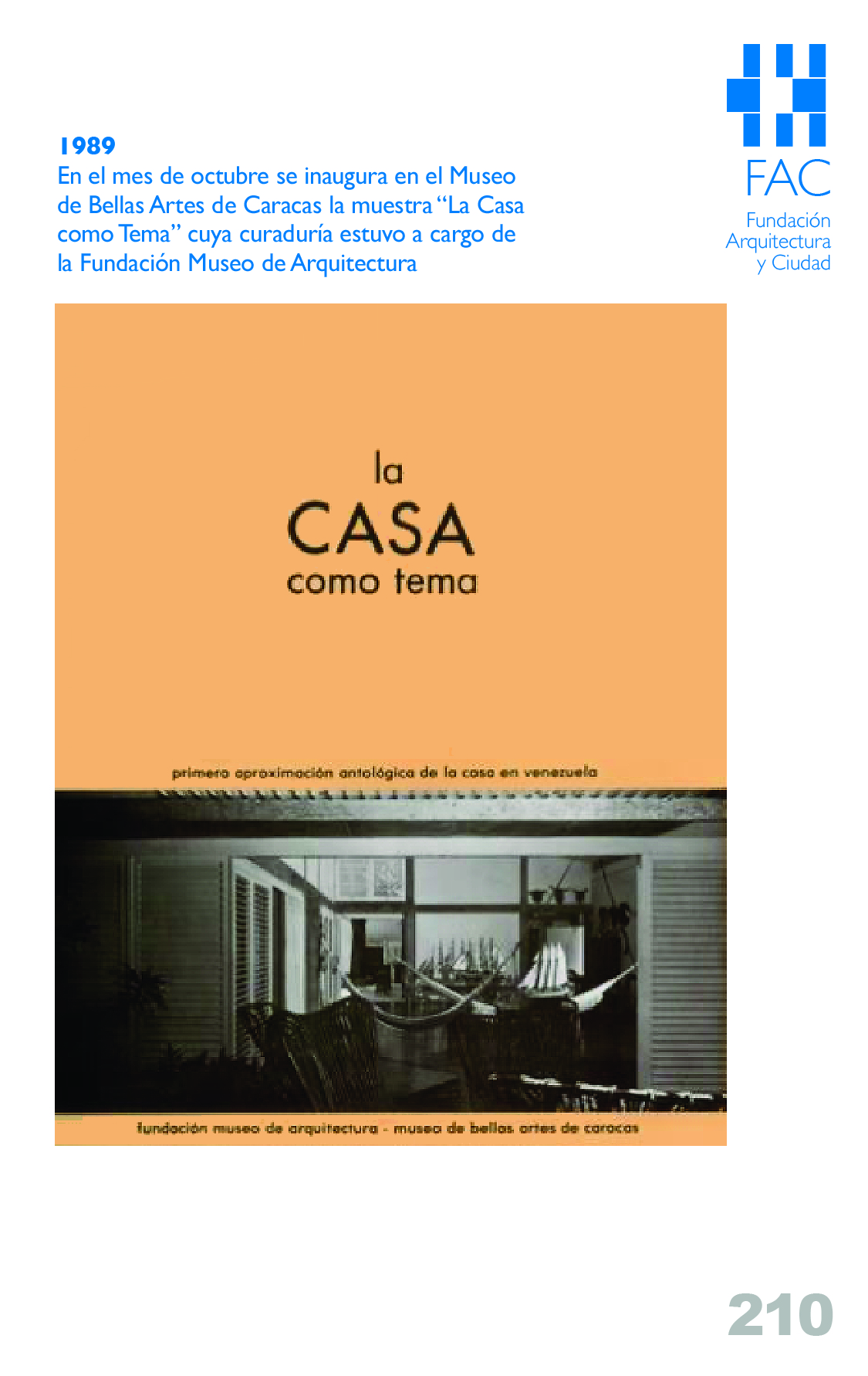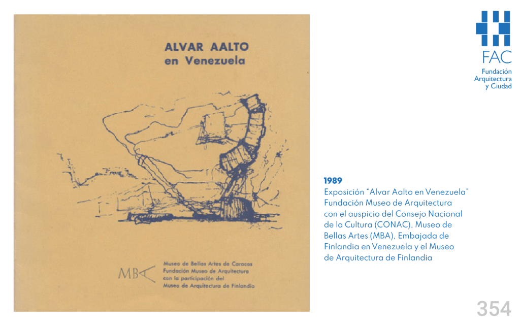 Para la Fundación Museo de Arquitectura (FMA), creada en 1988 por Hélène de Garay, Celina Bentata, William Niño, Martín Padrón, Juan Pedro Posani, Jorge Rigamonti, José Miguel Roig, Leszek Zawisza y Fernando Tábora, quienes asumieron también el rol de directores, la organización y apertura en el mes de abril de 1989 de la exposición “Alvar Aalto en Venezuela” significó la primera actividad de envergadura y el inicio de una alianza estratégica importante tanto con el Museo de Bellas Artes de Caracas (MBA) como con el Museo de Arquitectura Alvar Aalto de Finlandia. Se trató de una muestra itinerante que llegó a nuestro país gracias a las gestiones de la FMA y que contó con los auspicios de sus dos aliados a los que se sumó la entusiasta participación del excelentísimo Embajador de Finlandia en Venezuela Sr. Pertti Ripatti.