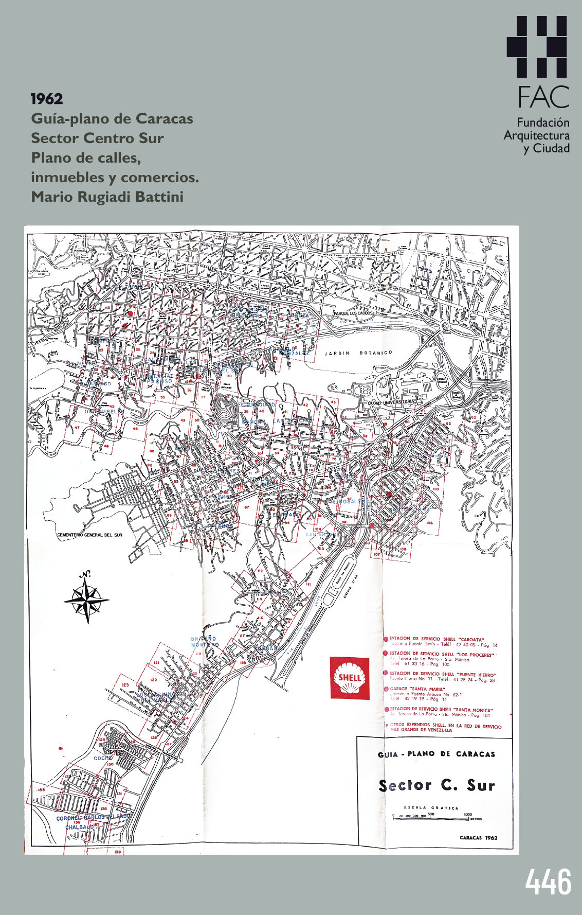 1. Portada de la «Guía-plano de calles, inmuebles y comercios de Caracas» (1962) correspondiente al sector Centro-Sur. Llama la atención que pese a ser la guía patrocinada por la Compañía Shell de Venezuela se haya seleccionado esta excelente foto (s/f), perteneciente hoy al Archivo Fotografía Urbana, que muestra antiguo edificio Creole (ocupado hoy por la Universidad Bolivariana de Venezuela), urbanización Los Chaguaramos, Caracas, diseñado por Lathrop Douglass a partir de 1947 y terminado de construir en 1954.
