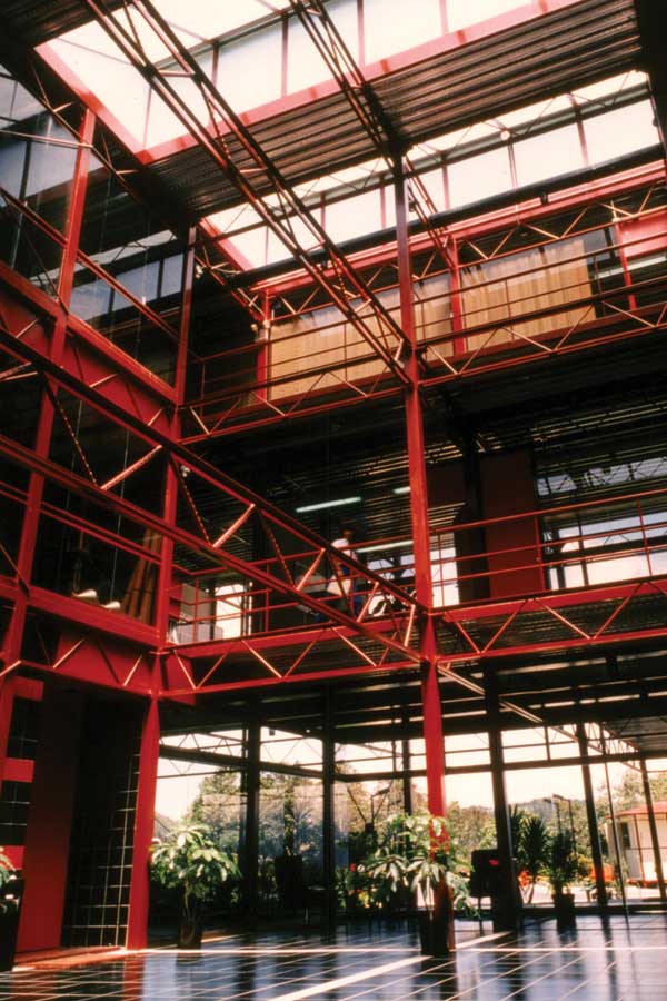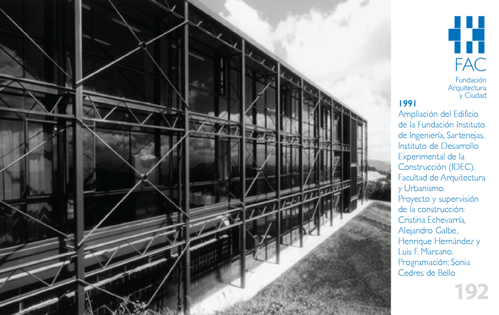 Pues bien, aquella entidad que empezó a convertirse en referencia desde un apartado rincón de Sartenejas, que operaba en edificaciones un tanto improvisadas, decidió ampliar y complementar sus instalaciones encargándole al Instituto para el Desarrollo Experimental de la Construcción -IDEC-, a través de la empresa TECNIDEC, S.A., el diseño y realización del edificio, para lo cual se conformó un equipo liderado por Henrique Hernández e integrado por Alejandro Galbe, Cristina Echeverría y Luis Marcano, con la participación de Sonia Cedres de Bello en la programación. Buscaba obtener una imagen edificada a tono con sus características y no fue para nada defraudada.
