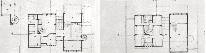 Las cubiertas y las escaleras son también temas de interés que aquí conviene repasar. Las primeras porque a pesar de su condición ligera asociada a la aparición del metal como material constitutivo, ocultan hacia el exterior su verdadera forma y esencia, revelándose hacia el interior como facilitadoras en la captación de la luz cenital, variando su dimensión y comportamiento de acuerdo a las características de los espacios que techen: a cuatro aguas para cada una de las habitaciones y ambientes que conforman el modulado volumen cúbico, o continua e integradora para las áreas sociales. Las segundas (las escaleras) por su diversidad y la escrupulosidad con que son manejadas para proveer la mayor independencia funcional entre las partes.