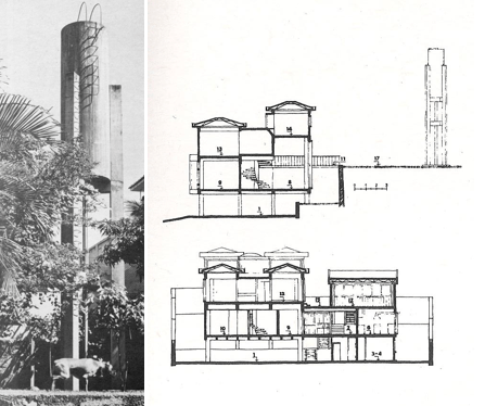 Es quizá Villanueva quien acompaña a la distancia el tino con que son manejados los criterios constructivos, estructurales y geométricos que respaldan la concepción de la casa. Así, vemos como no existe ningún temor en utilizar el concreto trabajado de diferentes maneras para sostener y caracterizar cada uno de los cuerpos que la conforman, dando pie, a pesar de la pequeña escala del edificio, a una particular exploración en tres tiempos. La primera se observa en el volumen prácticamente cúbico que contiene las habitaciones, cuya lectura es la de una caja suspendida sobre pilotis, donde su estructura aporticada cruciforme permite liberar las esquinas, llegándose a salvar luces importantes, con la colaboración de todos los elementos participantes, en pro del acoplamiento modular de las partes que lo integran, lográndose así convertir la planta baja en un confortable estacionamiento (omnipresente ante la discreción de los accesos peatonales). La segunda aparece en la pieza que alberga las áreas sociales y de servicios donde, por el contrario, se busca la generación de un contenedor prismático, sin columnas intermedias, que vuela hacia la calle, interesado en proveer internamente la mayor flexibilidad posible para los usos que así lo requieran, dando cabida en los niveles superiores a una rica integración espacial gobernada por la cubierta. Y la tercera a través del tanque de agua, elemento vertical que anima con su presencia el jardín posterior de la casa, convirtiéndose en la oportunidad de resolver, con la esbeltez como requisito, la suspensión en el aire mediante tres apoyos del cilindro que contiene el vital líquido en un alarde de transgresión a las leyes de la gravedad.