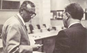 2. Benevolo y Pedro Rojas Rodríguez conversan durante el Seminario “Situación sobre la historiografía de la arquitectura latinoamericana”.