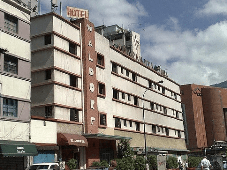 El Waldorf, que ocupó inicialmente una edificación ubicada en la avenida Norte 17 (hoy Las Industrias) entre las avenidas Este 1 (hoy avenida Urdaneta) y Este 0, o, dicho de otra manera, entre las esquinas de Campo Elías y Puente Anauco, Parroquia La Candelaria, es uno de los hoteles que formó parte del proceso de “americanización” de que fue objeto la zona de San Bernardino a raíz de su conversión en lo que Henry Vicente califica como el primer distrito petrolero de la ciudad en “Distritos Petroleros en CCS”, texto aparecido en el portal Prodavinci el 8 de agosto de 2017. Dicha “americanización” fue iniciada con la construcción del hotel Ávila (1942) y continuada con el Waldorf (1944), el Potomac (1949) y el Astor (1950), y estuvo acompañada por la ejecución en 1944 de la primera edificación sede en Venezuela de la Creole Petroleum Corporation en la Plaza Mohedano; la instalación de la Embajada de los Estados Unidos en el edificio Valderrey (1948) en San Bernardino; la ocupación por parte de la Mene Grande Oil Company del edificio Vulcania, también en San Bernardino; y de cinco pisos del recién construido Edificio Phelps (1946), obra del arquitecto estadounidense Clifford C. Wendehack, ubicado entre las esquinas de Veroes a Ibarras, por la Sinclair Venezuelan Oil Company. Adicionalmente se construirán el Centro Médico (1947), obra de Stelling, Tani & Cía., con asesoría de Edgar D. Martin, de Chicago; y luego la Shell contratará a Badgeley & Bradbury, una compañía de arquitectura de Nueva York, para la elaboración del proyecto de su edificio sede que terminará de levantarse en 1950 como remate de la avenida Vollmer.