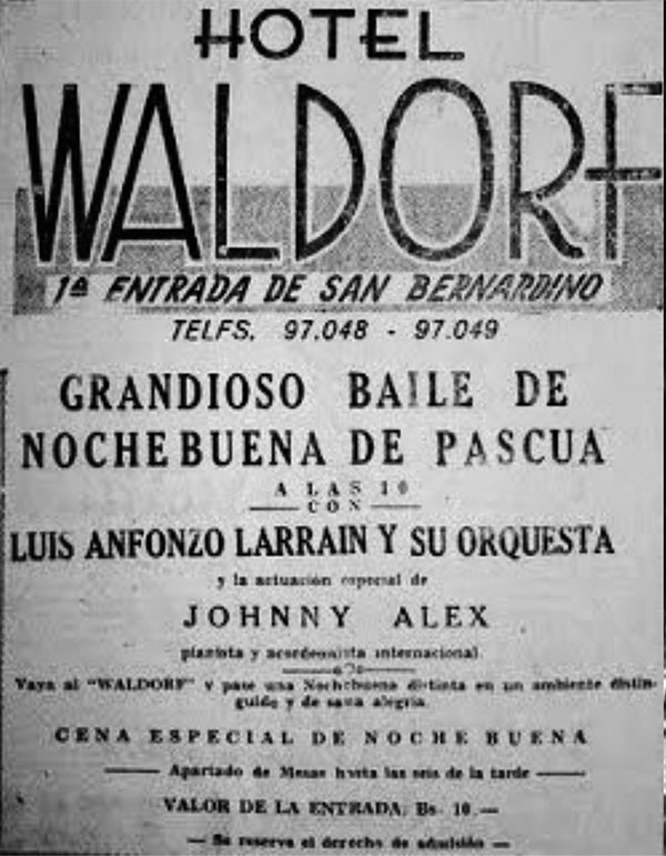 A lo anterior y a la usanza de la época, debe añadirse que el Waldorf también era uno de los puntos en los que la sociedad caraqueña tenía la oportunidad de celebrar fiestas y disfrutar de noches bailables en un ambiente sobrio, quedando para la posteridad un anuncio en el que se promociona la invitación a pasar la nochebuena al son de la muy conocida orquesta de Luis Alfonzo Larrain.