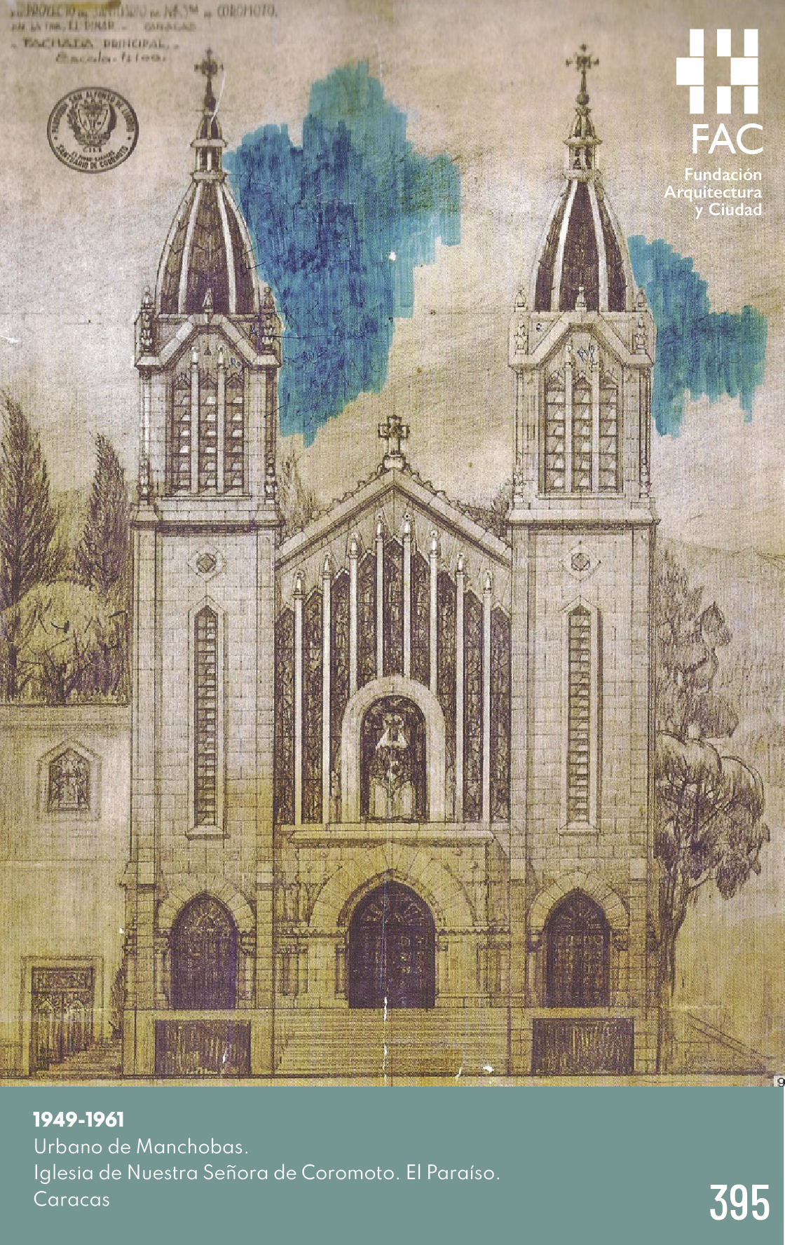 En diversas ocasiones nos ha tocado referirnos desde aquí al revelador número de arquitectos que, provenientes del exilio ocasionado por la Guerra Civil española, recalaron en Venezuela inyectando al desarrollo de la disciplina un significativo nivel cualitativo. Hoy nos corresponde referirnos a Urbano de Manchobas Careaga (Mantxobas, en euskera), nacido en 1887 en Ermua, Vizcaya, País Vasco, quien arribó a nuestro país en 1939 permaneciendo aquí hasta su fallecimiento en Caracas en 1968. De una de sus últimas obras construidas, la remodelación de la Iglesia de Nuestra Señora de Coromoto, ubicada en la urbanización El Paraíso (finalizada en 1961), hemos decidido reproducir el dibujo de la fachada principal del proyecto original para engalanar nuestra postal del día de hoy.
