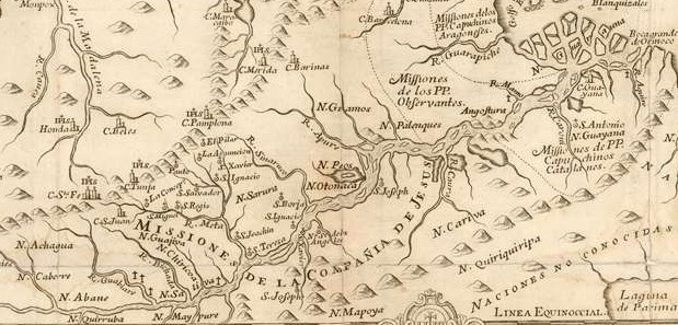 La orilla norte del Alto Orinoco era el corazón de la actividad misionera jesuita en la región. De hecho, toda esta área está etiquetada como tal. Allí se identifican catorce misiones jesuitas, principalmente entre el río Meta y el río Cinaruco, en lo que hoy es el oeste de Venezuela. Al sur aparecen tres misiones, con otros dos ríos abajo. Sin embargo, los jesuitas no pudieron penetrar más al oeste a lo largo del Orinoco: allí, cuatro cruces marcan los lugares donde murieron los padres misioneros. Un sutil pero poderoso recordatorio del altísimo costo que tuvo la incursión jesuita en estas tierras inexploradas.