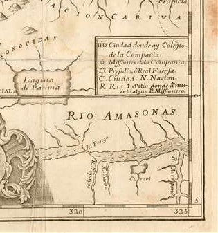 5. Esquina inferior derecha del mapa donde se aprecia la ubicación de la Laguna de Parima, la leyenda que permite identificar datos aportados y el señalamiento del río Amazonas, único territorio conocido con propiedad al sur del ecuador.
