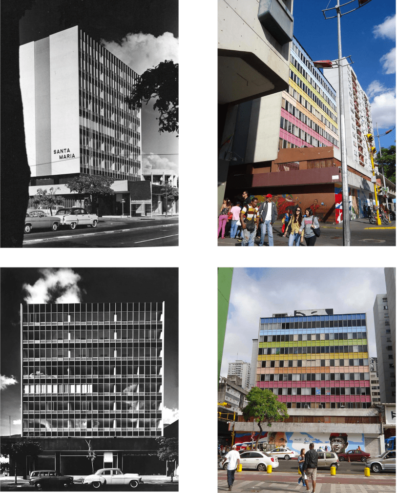 Sin que nos conste que en el caso del edificio Santa María haya sido así, vale la pena recordar que para resolver el cerramiento definitivo del Polar, Vegas & Galia, cuando la estructura ya estaba concluida y se disponían realizar las fachadas según el proyecto original (a semejanza del edificio El Municipal), convocaron a representantes y vendedores de los cristales Saint-Gobain (ofrecidos como aislantes y absorbentes de la radiación solar) y de ACO, S.A. distribuidores y también representantes de la compañía norteamericana ALCOA (Aluminum Company of America), quienes les ofrecieron utilizar sus productos, siendo estos últimos con quienes finalmente se concluyó la obra no sin antes tener que sortear importantes inconvenientes técnicos tanto de instalación como de filtración del agua cuando llovía. De esta manera, entre 1953 (cuando se termina el Polar) y 1959 (fecha de apertura del Santa María), aunque tímidamente varios edificios asumieron esta manera de envolverse que daba protagonismo a la superficie vidriada (Centro Comercial del Este -1953- de Diego Carbonell, Cámara de Comercio de Caracas -1954- de Julio Volante, Edificio de Radio Continente -1956-, Edificio del Rectorado del Colegio San Ignacio de Loyola -1958- de Erasmo Calvani y Juan Capdevila Elías y Palacio Municipal de Maracaibo -1959- de Miguel Casas Armengol, por citar algunos), ninguno lo hará con la maestría y contundencia con que Heufer la maneja, para lo cual debe haber contado con la asesoría de los proveedores de productos importados de los Estados Unidos tal y como lo hicieran Vegas & Galia en su momento.