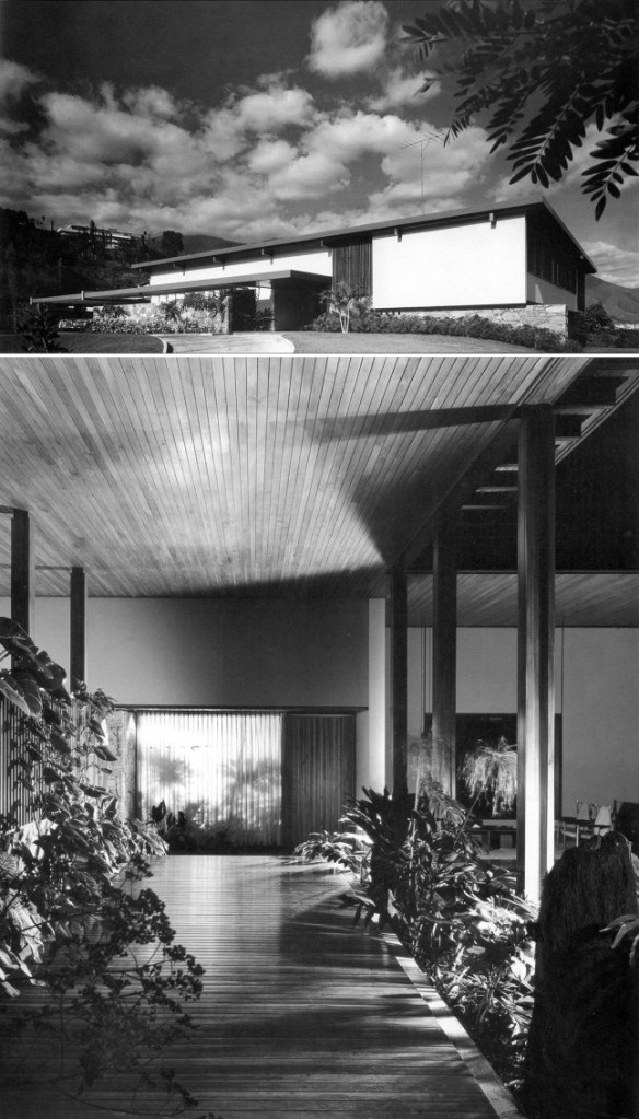 Tal y como recoge Lorenzo Dávalos en el hermoso reportaje que apareció en su blog caracas 10N, 67W titulado “Klaus Heufer y su persistente pasión por los detalles”, del 27 de agosto de 2013 (https://caracas1067.wordpress.com/2013/08/27/la-persistente-pasion-por-los-detalles-de-klaus-heufer-1/) con motivo de la celebración de los 90 años del arquitecto alemán: “Más estrictamente, las casas de Heufer son variaciones modernas de ese estilo de casa. El término patio designa una diversidad de espacios (techados o no) que están ubicados en el límite entre el exterior y el interior de la casa y que se puede utilizar para comer o socializar. Dos variantes de este espacio que han sido felizmente integradas en casas modernas son: el atrium y el lanai. Se define como atrium a un espacio sin techo ubicado en el centro de la casa, y como lanai (término de origen hawaiano recuperado por arquitectos como Vladimir Ossipoff, 1907-1998) o porche, a los espacios sin paredes pero con techo y paneles de vidrio corredizos que separan este espacio del exterior”.