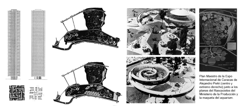 2. Expo Internacional de Caracas. Alejandro Pietri. Junto al Plan Maestro (centro izquierda y extremo derecho) se muestran planos del rascacielos del Ministerio de la Producción (izquierda) y fotos de la maqueta del aquarium (centro derecha)