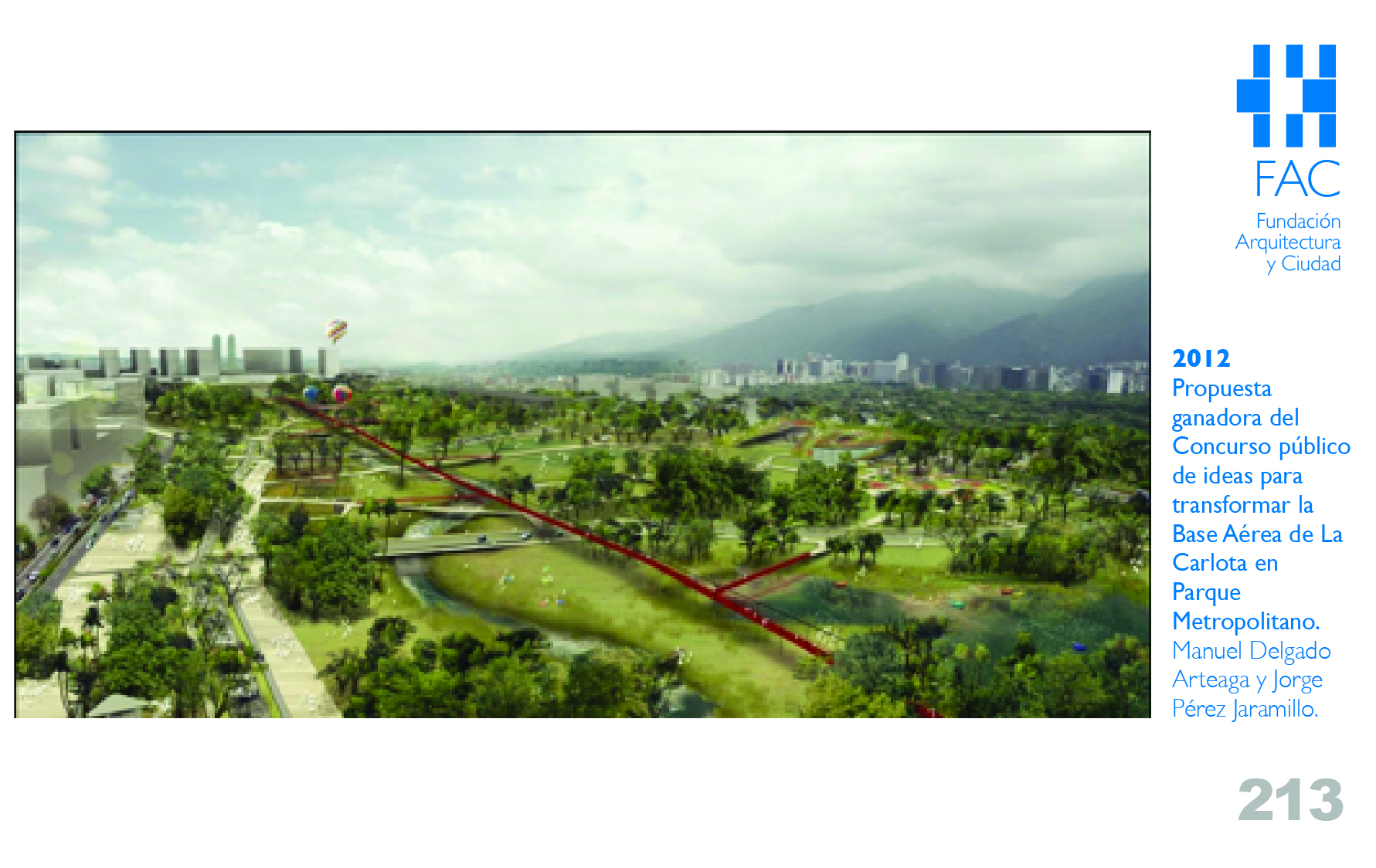 Por un lado, el 20 de marzo, en el marco del 445 aniversario de la fundación de la ciudad, la Alcaldía del Área Metropolitana de Caracas, conjuntamente con organizaciones representantes de la sociedad civil, academias, gremios, alcaldías de los municipios integrantes del Área Metropolitana, la Gobernación de Miranda, el Colegio de Arquitectos de Venezuela, el Colegio de Ingenieros de Venezuela y el Cabildo Metropolitano, organizó el “Concurso Público de Ideas para transformar la Base Aérea La Carlota en Parque Verde Metropolitano”, reseñado en estas páginas el 7 de junio de 2020 en el Contacto FAC nº178 y cuyos ganadores, Manuel Delgado Arteaga (Venezuela), Jorge Pérez Jaramillo (Colombia) y OPUS-Oficina de Proyectos Urbanos (Colombia), fueron conocidos en acto público el 28 de noviembre.
