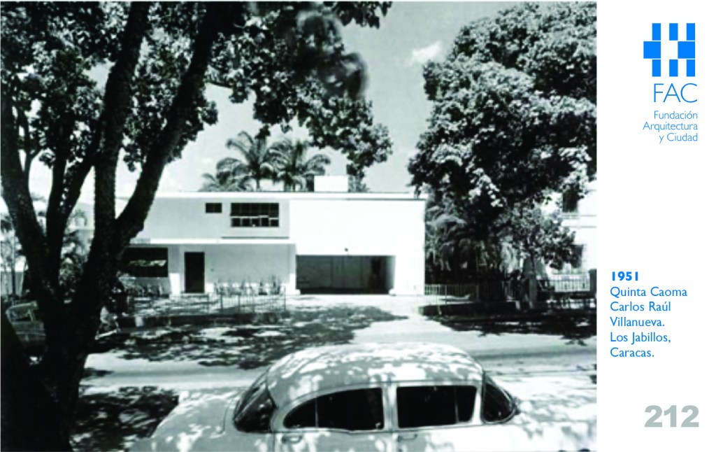 Vale la pena recordar que Carlos Raúl Villanueva llega a Venezuela justamente en 1928 en pleno proceso de gestación de La Florida y que contraerá nupcias con Margot Arismendi Amengual (hija del promotor del urbanismo) en 1933. Este hecho le permitirá diseñar en la urbanización sus dos primeras viviendas familiares: la casa nº36 de la avenida Los Manolos cruce con Los Samanes (frente al club) en 1934 (demolida en 1979), y luego Caoma en la avenida Los Jabillos de 1953 (que habitará hasta su fallecimiento en 1975), construida tras derribar la quinta propiedad de su esposa que ocupaba la parcela donde se habían mudado a finales de la década de 1930 de la que sólo se conservará el nombre. También le dará la oportunidad de colaborar con su suegro proyectando numerosos modelos de quintas dentro de la urbanización que se repetirán y estarán al alcance de un mayor número de personas, las cuales han sido estudiadas por Luis Polito en “Las quintas de Manuel Mujica Millán y Carlos Raúl Villanueva alrededor de los años ’30”, Trabajo Final presentado para obtener el título de Magister Scientiarum en Historia de la Arquitectura de la FAU UCV en 1996.