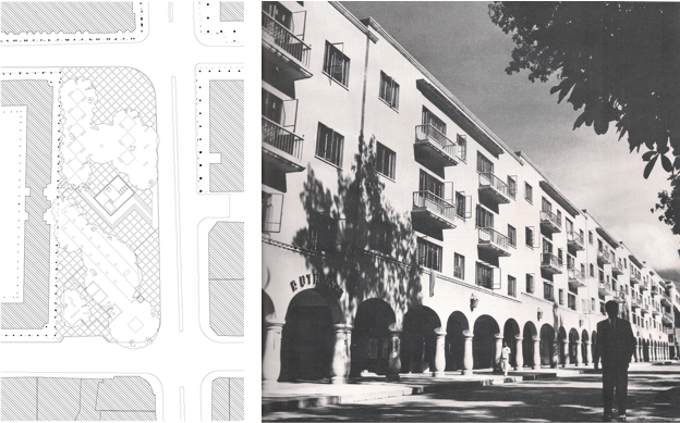 Mientras Villanueva desarrollaba aceleradamente el proyecto, incorporando un lenguaje que buscaba retrotraer el espíritu colonial y la adaptación al clima donde hacen acto de presencia corredores, patios, portadas, rejas, molduras pesadas y arcos, para convivir con el racionalismo y funcionalidad de las soluciones dadas a las unidades de vivienda, De Sola nos recuerda que “el 25 de julio de 1942, día de Santiago, aniversario de la fundación de la ciudad de Caracas (375 años), a las 11: 15 am, el presidente de la República, general Isaías Medina Angarita, acompañado por el gobernador del Distrito Federal, doctor Luís Gerónimo Pietri, el ministro de Obras Públicas, doctor Manuel Silveira, el director-gerente del Banco Obrero, señor Diego Nucete Sardi, así como de los otros directores del Banco e invitados al acto, efectúo la ceremonia del primer golpe de pico en la casa distinguida con el Nº 23, situada al Oeste de la Plaza Miranda; en dicha casa operaba un taller de vulcanización, siendo los vecinos más cercanos el Restaurant ‘La Granja’, ‘el nuevo hospedaje para caballeros’, ‘La Unión’ empresa de viajes y mudanzas, la ‘Agencia Royal’, el Bar ‘Napolitano’, y ‘La Pluma de Oro’”.