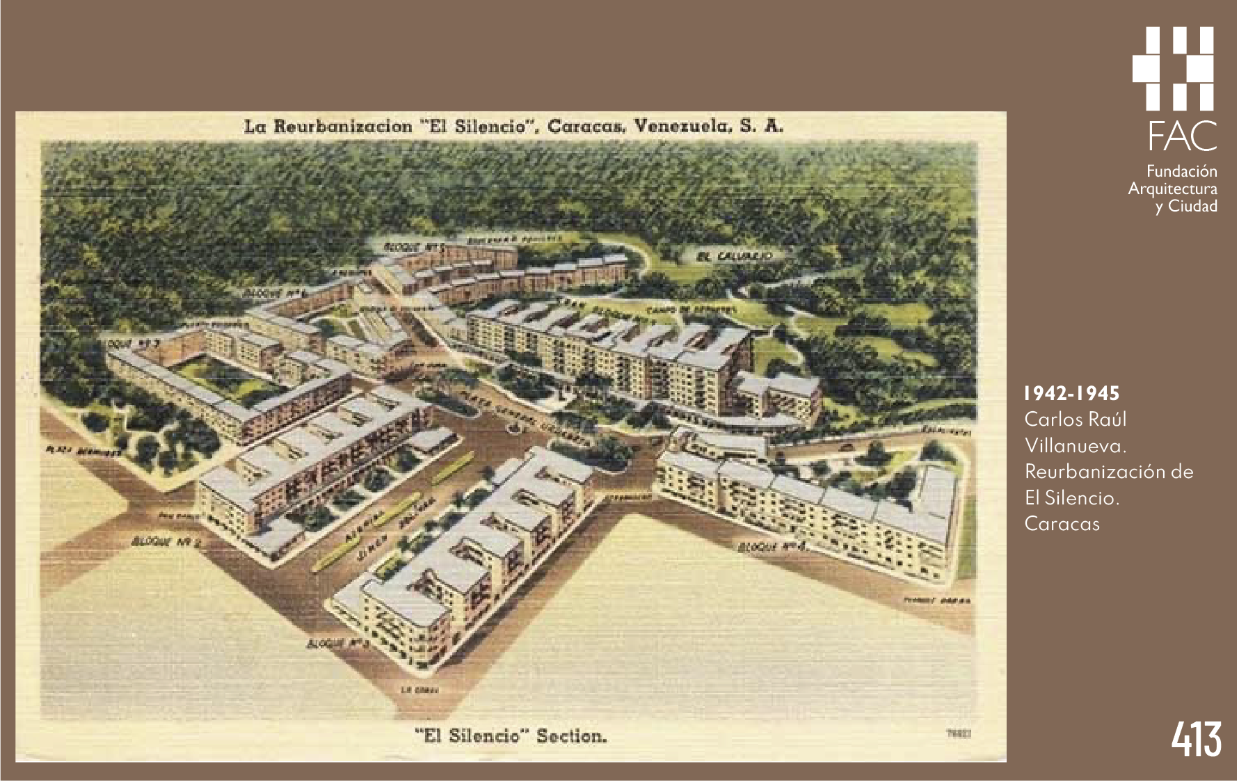 Ricardo De Sola en el libro La Reurbanización de “El Silencio”. Crónica 1942-1945 (1988), apunta a que ya la primera propuesta de Villanueva presentada en marzo preveía la elevación de los bloques sobre columnas y corredores perimetrales, mientras en la segunda opción de mayo mantuvo ese criterio definiendo el espacio central como final proporcionado a la llegada de la avenida y otorgando al Bloque 1 un carácter dominante frente a ésta y la plaza, todo lo cual es recogido en el dibujo que ilustra nuestra postal del día de hoy. Pérez Rancel completará lo dicho por De Sola señalando que “también esa segunda opción definía las siluetas urbanas de los 7 bloques en su misma futura implantación, tal como continuarían desarrollándose en la etapa de proyecto. Y adicionalmente mostraba ya unas hipotéticas arcadas en la planta baja del Bloque 1 y en el lado Norte del Bloque 2, aunque no todavía en los demás bloques, cuyo diseño arquitectónico estaba todavía por alcanzarse. Las dos plazas (O’Leary y Miranda) quedaban también insinuadas esquemáticamente en sus formas y decididas en su ubicación, esperando su diseño definitivo”.