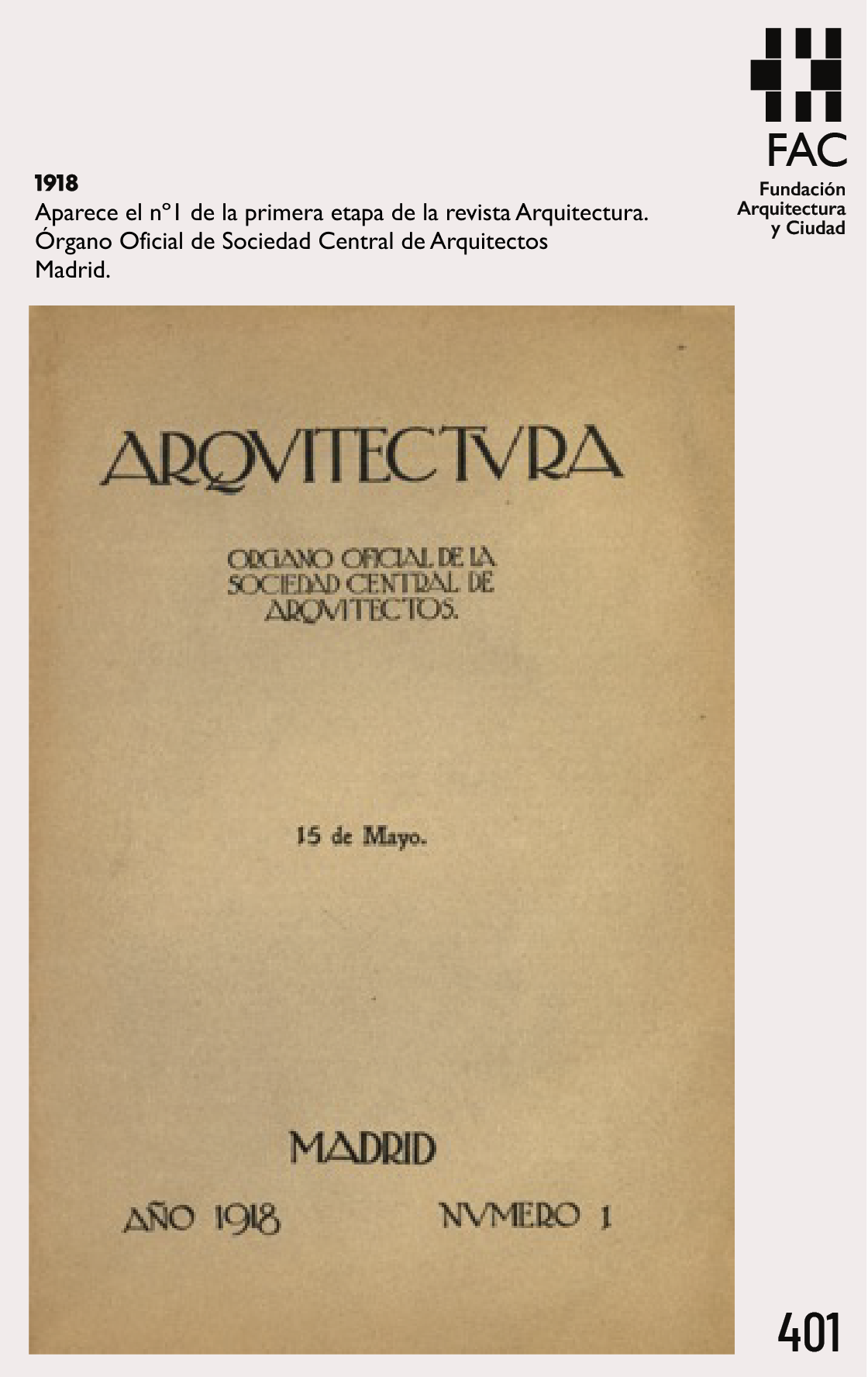 No sabemos a ciencia cierta cual es la revista de arquitectura hispanoamericana más longeva. Varias se disputan ese renglón reconociéndose como la pionera, en cuanto a aparecer de forma independiente, la revista Arquitectura de la Sociedad de Arquitectos del Uruguay (SAU) de 1914, aún activa, que ha llegado con los correspondientes sobresaltos propios de toda publicación periódica a su número 274 en 2022. Sin embargo, si hay alguna que, perteneciente también al ámbito de las organizaciones profesionales y casualmente con el mismo nombre de su par uruguaya, se ha mantenido con asombrosa continuidad y ha sorteado los consabidos obstáculos sin dejar de mantenerse a flote es Arquitectura, lanzada como órgano Oficial de la Sociedad Central de Arquitectos (hoy Colegio Oficial de Arquitectos de Madrid -COAM-) el 15 de mayo de 1918, a cuyo nº1 hemos dedicado nuestra postal del día de hoy.