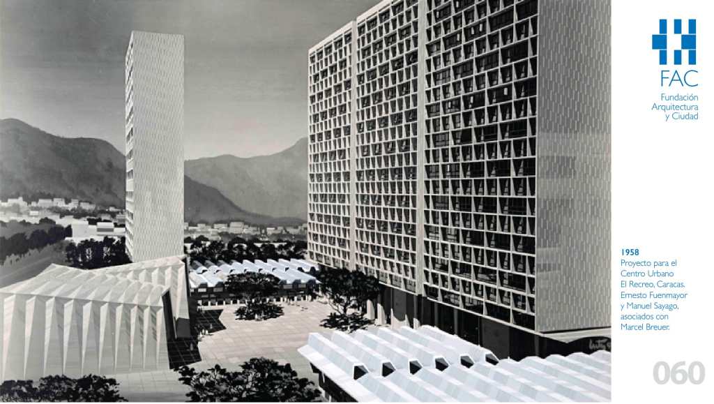 19. Trasnocho Arte Contacto (TAC). Our Architects en Caracas. Arquitectura norteamericana en Caracas, 2017 y Mujica V. “El Centro Urbano El Recreo, un modelo de construcción de la ciudad” en Trienal de Investigación FAU, 2014 y en http://www.materialcultural.com/el-centro-urbano-el-recreo-de-marcel-breuer/