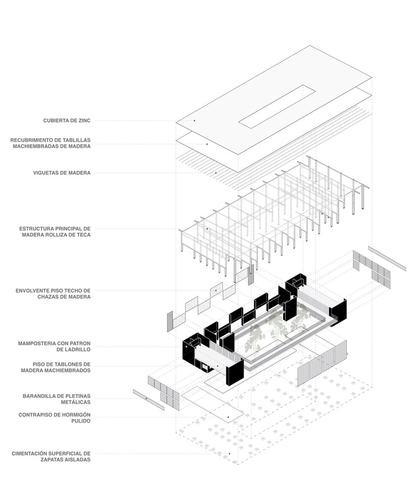 Como fundamento espacial que organiza la propuesta, “se propone un patio con vegetación endémica como lugar de encuentro y exposición que está contenido por dos naves laterales y una central; uno contiene aulas formativas teóricas, cafetería y servicios higiénicos; el otro, talleres de aprendizaje práctico, espacio de dormir, bodegas y una tienda para vender los productos desarrollados en la nave central donde se realizan los tejidos artesanales. (…) El frente principal es una galería productiva-expositiva que sirve como filtro del patio y como elemento para generar urbanidad hacia la calle. Mientras que la cara posterior se cierra hacia el espacio medianero para generar mayor seguridad. (…) Se plantea el uso de madera de teca rolliza como estructura principal comúnmente utilizada para los pilotes de las viviendas palafíticas en zonas vulnerables de la región por su dureza y durabilidad, soportando la cubierta y el piso en planta alta. (…) Las paredes de ladrillo están trabajadas con tejido de espina de pez y rigidizados por la propia forma de los muros trabados. Las puertas de chazas abatibles de madera son utilizadas para el control de la ventilación, iluminación y vinculación entre el exterior e interior. (…) Para la iluminación natural y la ventilación se utilizan puertas de celosía plegable de madera para controlarlas, trabajando también como enlace entre el exterior y el interior. Esto, centrado en un bajo consumo energético, teniendo en cuenta la alta humedad y las temperaturas en la zona”.