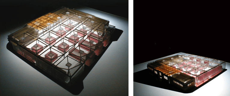 Se organiza el edificio en torno a un patio de cuatro niveles de altura que alcanza los 20 metros cuyo centro “está protegido por un sistema de cubiertas acristaladas que permiten la entrada de luz natural, lo que le confiere la calidad de espacio abierto”. Si hacia el exterior predomina el hermetismo y el controlado color que provee el ladrillo, hacia el sorprendente interior son la luz y el concreto obra limpia los que ofrecen el marco ideal para el desarrollo tanto horizontal como verticalmente de la dinámica, bulliciosa y colorida actividad que se alberga.