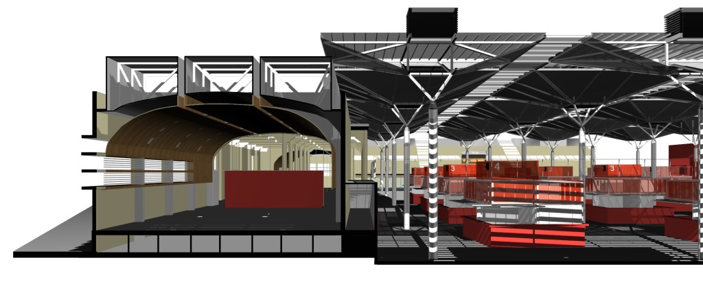 En consonancia con el Plan Maestro, Manrique & Tamayo proponen el mercado con el carácter de un edificio institucional que establece el límite este de una plaza que techa los estacionamientos (con capacidad para más de 700 puestos) y que al sur se cierra con los tres volúmenes que contendrían a la nueva sede de la escuela Andrés Bello, el Centro Cultural y el Gimnasio Vertical, ocupando el área donde se ubica el mercado actual.