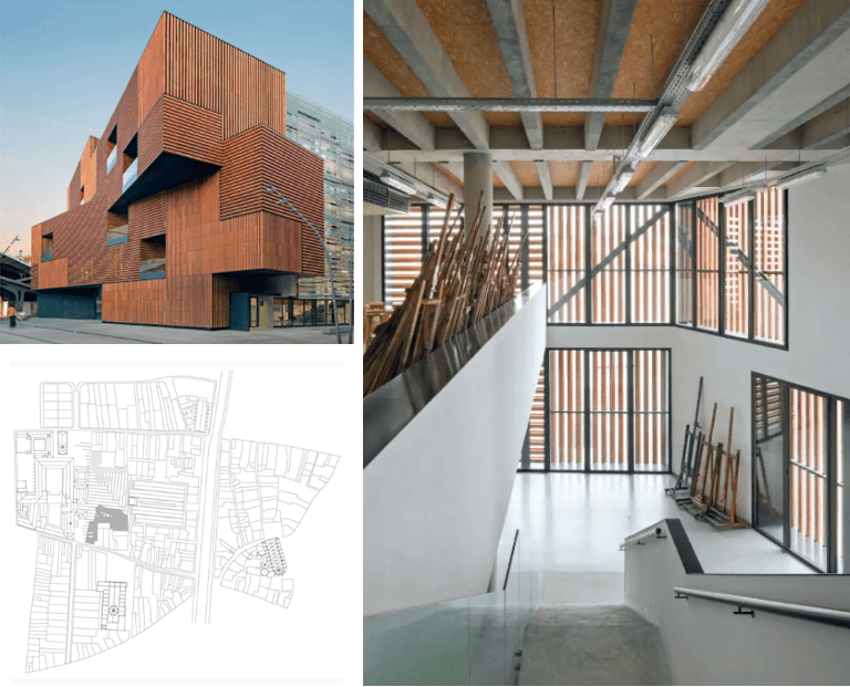 El programa del edificio se desarrolla principalmente en planta baja y en cinco plantas superiores, más una planta sótano. Los espacios se organizan según los diferentes usos, ya sean talleres o aulas. Las aulas, orientadas hacia el sur, y los talleres, hacia el norte, están separados por un gran atrio central, que actúa como un pasaje urbano en potencia.