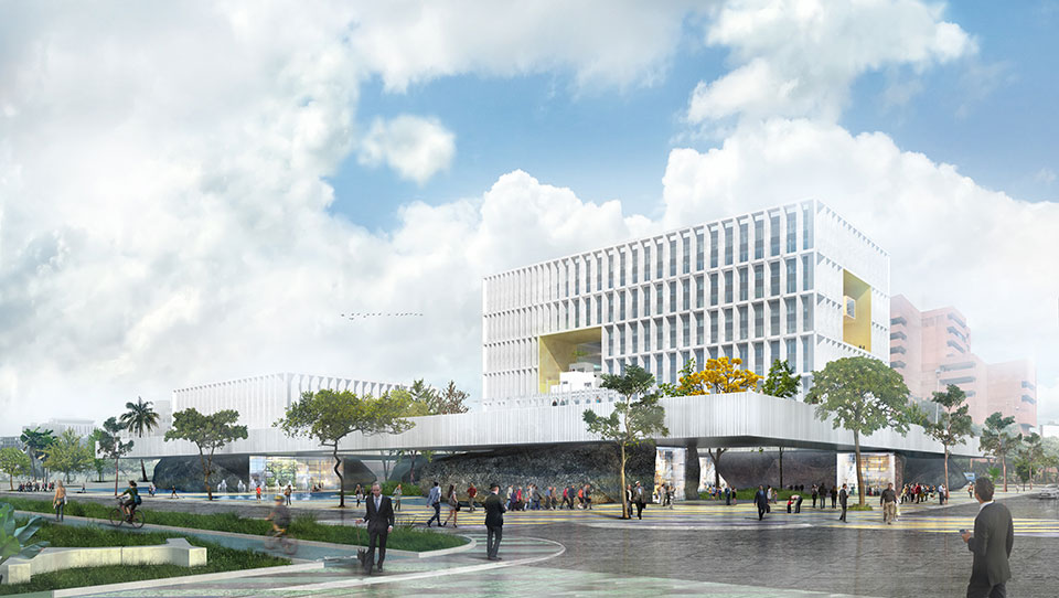 A los ajustes sucesivos a que se sometieron las primeras ideas se sumó el tratamiento propuesto para el hall de acceso del edificio entendido como una “plaza cubierta” desde donde se pudiera “atravesarlo mediante una calle interna escalonada”. “La edificación comienza a funcionar como un edificio urbano: plaza cubierta, pequeña plaza interna (patio en escalera) y una calle peatonal que permitiera la conexión entre las calles colindantes. La edificación se planteó como una pieza adaptable a las distintas situaciones espaciales y formales del contexto. (…) En ese momento, la imagen de casa se transformó en imagen de edificio institucional (Centro Cultural) que responde al contexto de una manera uniforme con una geometría ligera y severa al mismo tiempo”.