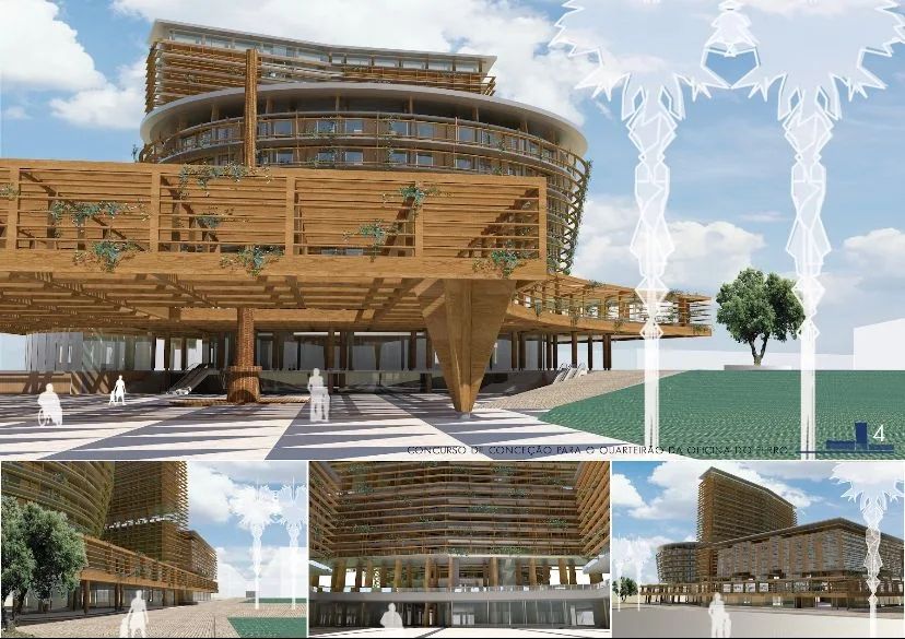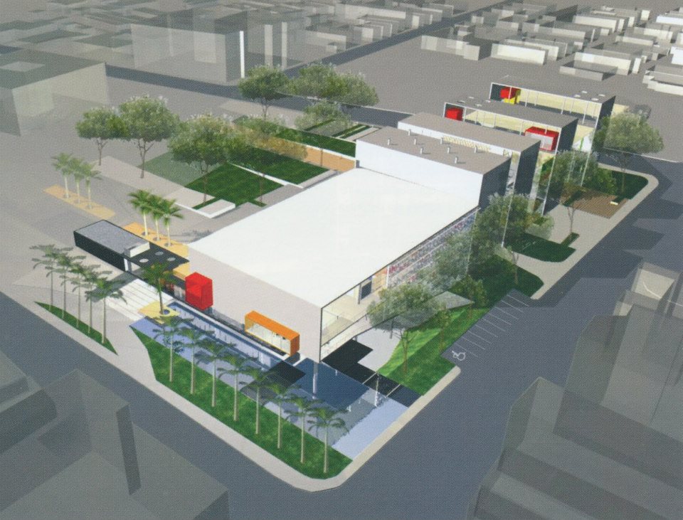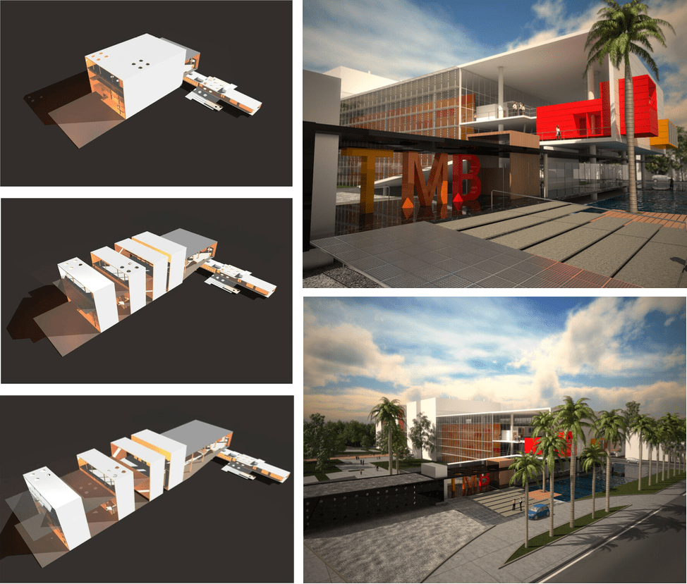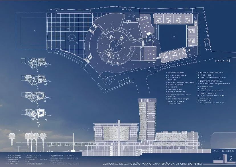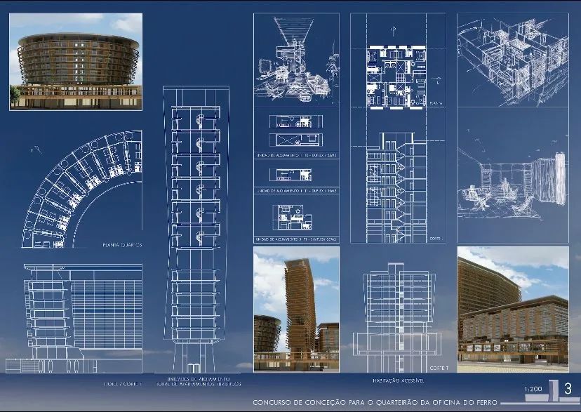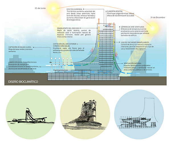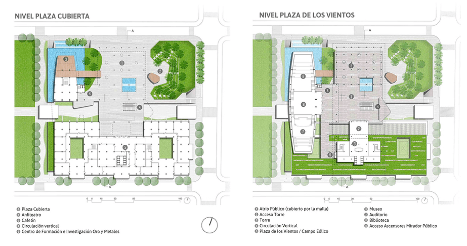 Las ideas expuestas dieron pie a lo presentado a concurso luego de un rico proceso en el que, en primer lugar, la geometría triangular del terreno (con los tres lados diferentes entre sí) obligó a adaptar la forma rectangular del patio tradicional. Ello junto a las consideraciones topográficas llevó a proponer la imagen de un “triángulo cubista” el cual fue boceteado “repercutiendo en el conjunto en formas geométricas curvas, rectas y quebradas”.