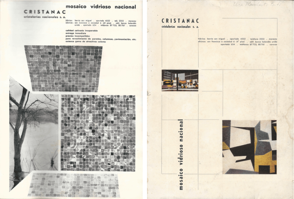 CRISTANAC, cuya fábrica se encontraba en el Barrio San Miguel de Maracay y sus oficinas en Caracas entre las esquinas de San Francisco y Sociedad en el edificio Magdalena, de cuya fecha de creación como industria nacional fabricante de “mosaico vidrioso” no poseemos datos exactos, ya aparece anunciada en el nº1 (1954) de A, hombre y expresión. Seguramente sigue la senda abierta por las importaciones iniciales provenientes desde Italia en cuanto a detectar un mercado pujante y creciente de uso del material y en cuanto a aprovechar al máximo las técnicas asociadas a su fabricación. De hecho, si los primeros murales de la CUC (1951-53) se realizaron con material veneciano fabricado por Sarim e importado por Cappellin, CRISTANAC ya empieza a abrirse paso y aparece de la mano de Pascual Navarro como firma fabricante de los “mosaicos vítreos industriales de 2×2 cm” del impactante mural curvo (259 x 1592 cm), fechado en 1954, ubicado en la Plaza Cubierta de la CUC y de otro igualmente curvo de menores dimensiones (308,5 x 1000 cm) diseñado por Mateo Manaure para el exterior del Aula Magna entre el corredor cubierto y las taquillas, el cual forma parte de la etapa correspondiente a una abstracción geométrica más influenciada por Kazimir Malévich y Piet Mondrian, que constituye el grueso de su aparición con un total de 26 de las 69 obras murales presentes en el campus entre 1951 y 1956, en las que CRISTANAC entre el 54 y el 56 seguramente fue importante proveedora de la materia prima y habilidosos artesanos los encargados de trabajarla para logran el grado de perfección que todos podemos todavía apreciar.