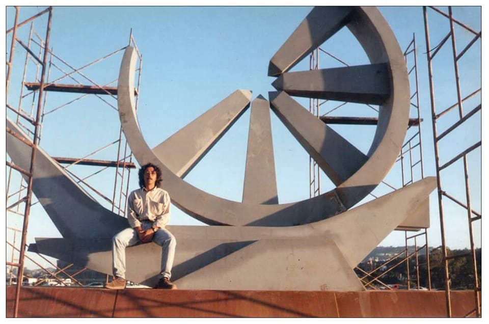 El autor de “Mira de alta mar”, Julio Pacheco Rivas, durante la instalación de su obra en el distribuidor de la Autopista Francisco Fajardo que conduce hacia la urbanización Altamira, en Chacao. Foto de Eve Paván.