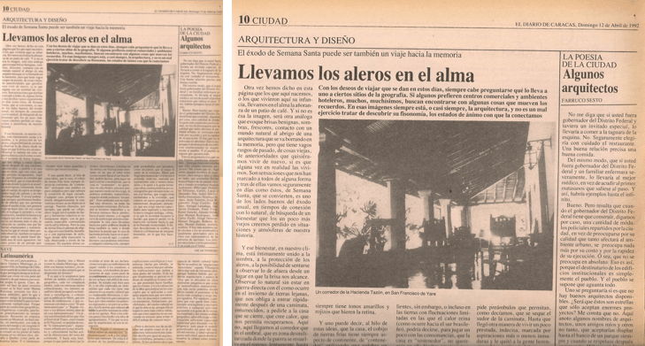 Un Domingo de Resurrección pero de 1992 (que entonces cayó 12 de abril), Oscar Tenreiro publicó en la página Arquitectura y Diseño, sección Ciudad, de El Diario de Caracas, donde semanalmente escribían tanto él como Farruco Sesto, el artículo titulado “Llevamos los aleros en el alma”.