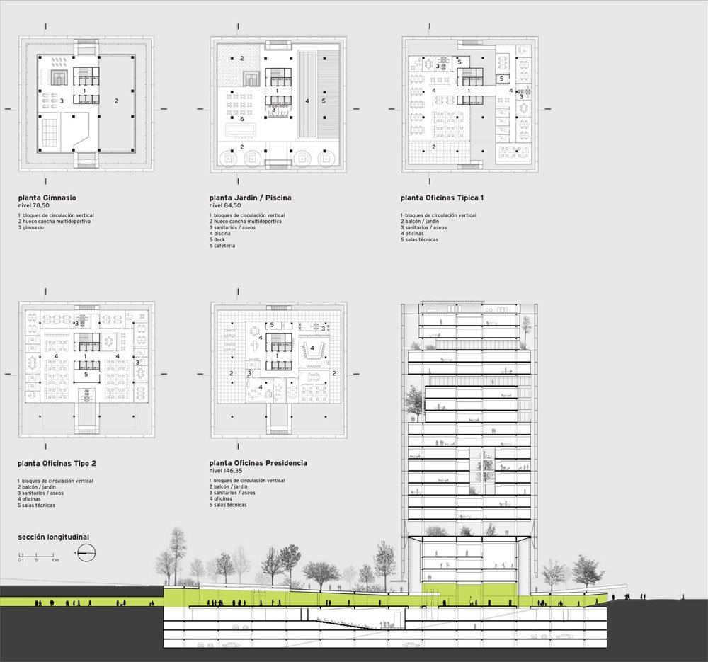 Continúan Gómez y Sánchez Taffur refiriéndose al segundo nivel en el que se desarrolla la organización programática indicando que, “ubicado a unos 4 metros bajo el nivel de la calle y de naturaleza multipropósito, fue pensado para albergar generosos espacios de recepción de los flujos de usuarios provenientes de los seis accesos disponibles en las inmediaciones de la estación, y cuenta con amplios pasillos de distribución, locales comerciales, servicios públicos, estaciones para la venta de boletos, sala de controles de la estación, un punto de información al público, depósito de baterías de emergencia para la estación, sala de bombas, oficina para la vigilancia, estación de primeros auxilios, torniquetes de controles de acceso y sistemas de circulación vertical para el desplazamiento desde y hacia los andenes de abordaje de trenes. (…) El tercer nivel, ubicado a 8 metros bajo el nivel de la calle, es propiamente la estación de trenes. En él se encuentran los espacios de recepción y espera de pasajeros. Se trata de un ancho andén central al que se llega a través de los sistemas de circulación vertical provenientes del nivel intermedio. Adicionalmente, en este nivel se ubican los rieles y los túneles ferroviarios, sistema de drenaje, salas de ventilación mecánica y presurización, instalaciones eléctricas, espacios para mantenimiento y seguridad”.