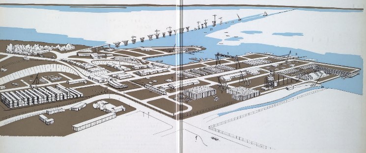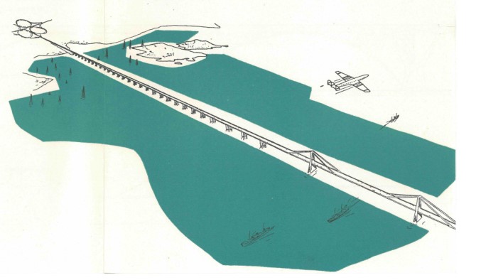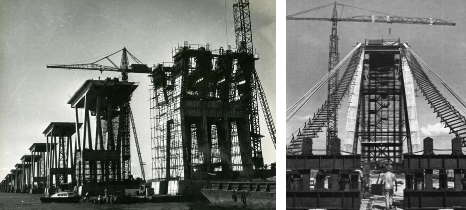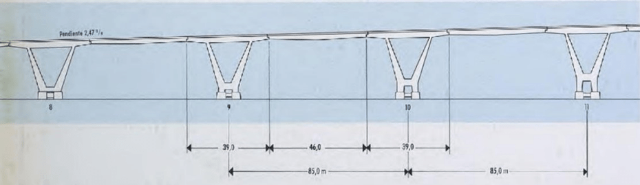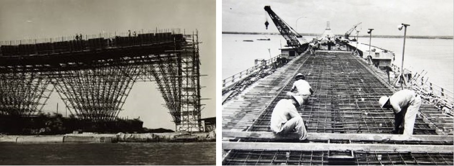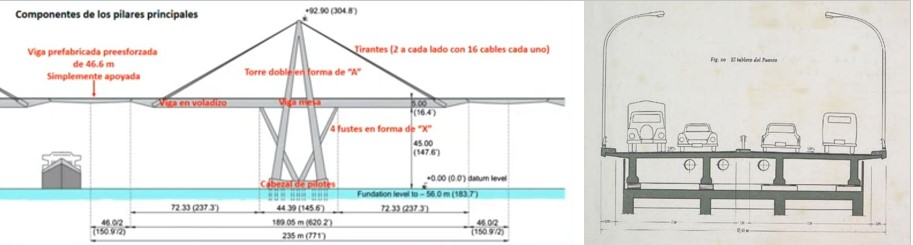 Para ilustrar sólo en parte la audaz superestructura que se usó en el tramo central del puente donde se ubican los pilares principales, el dibujo que engalana nuestra postal del día de hoy muestra la viga en voladizo que con sus 72 mts de largo se convirtió en la primera en la historia soportada en su punta por tirantes. Además, fue necesario el uso de una viga-cercha provisional soportada en el extremo por una pila-cabezal temporal y en la viga mesa en el extremo opuesto.