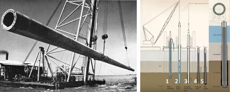 En Maracaibo, tanto o más importantes como las innovaciones incorporadas en la superestructura del puente (gracias al empleo plantas de prefabricación y maquinaria marina), son las correspondientes a las fundaciones ubicadas bajo el agua, en las que utilizaron hasta tres tipos de pilotes de acuerdo al tramo del puente de que se tratara en concordancia con la resistencia del suelo. Los dos primeros eran hincados con martillo (con dimensiones de 50×50 cms y diámetro de 91,4 cms, respectivamente y longitudes también diferenciadas). El tercero, perforado, con un diámetro de 135 cms, longitud máxima de 57,5 m y capacidad de carga de hasta 2000 Tm, creado específicamente para la ocasión, tendría un carácter especial ya que no se había utilizado nunca antes en obra de ingeniería alguna.