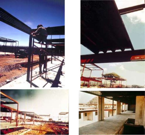 Se optó, tal y como se puede observar en la fotografía aérea que ilustra nuestra postal del día de hoy, por adoptar una solución horizontal organizada teniendo como corazón un gran espacio o plaza central (acompañado de un amplio estacionamiento) en torno al cual se colocaron la capilla (de planta circular) como elemento protagónico, las actividades culturales (de las que destaca la silueta del auditorio) y las directivas, disponiéndose el resto de los cuerpos contentivos de las áreas de aulas diferenciadas según los niveles educativos y alejadas entre sí: una hacia el norte y otra hacia el sur donde también se ubica la zona de servicios generales. Todo el conjunto se encuentra vinculado por una serie de corredores cubiertos que permiten comunicarse bajo sombra a lo largo del extendido edificio de 34.000 m2 de construcción destinado a una población de 1.500 alumnos.