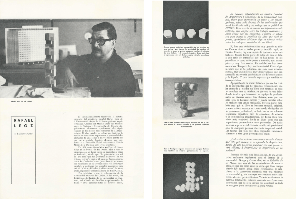En tal sentido sólo rescatar que relacionados con sus visitas y su figura, en nº 13 de PUNTO (julio 1963) se publica un artículo de 5 páginas de Leoz, preparado especialmente para la revista, titulado “Reflexiones de un arquitecto”; en el nº 32 (julio-agosto 1967) se reseña la conferencia titulada “División y organización del Espacio Arquitectónico”, dictada del 23 de junio de 1967 en el Auditorio de la FAU UCV; en el nº 38 (junio 1969) aparece una interesante entrevista que Granados Valdés le hiciera a Leoz en Madrid; en el nº 40-41 (enero-marzo 1970) se reseña el nuevo premio obtenido por Leoz en el Congreso Mundial de la U.I.A, celebrado en Buenos Aires en el mes de octubre de 1969, por la película “Arquitectura hacia el futuro”; en el nº 42 (abril-junio 1970) se anuncia la salida a la luz de Redes y ritmos espaciales; y, ya fallecido, en el nº 61 (junio 1979), aparece como noticia la visita que hiciera al país, y en particular a FAU UCV el 19 de enero, su viuda Carmina Ayuso de Leoz (Presidenta de la Fundación Rafael Leoz).